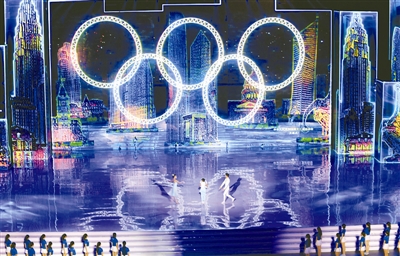9月8日晚,第十三届全运会在天津体育馆举行了闭幕式。闭幕式上还进行了题为《幸福万万家》的文艺表演。图为奥运五环出现在闭幕式文体展演中。