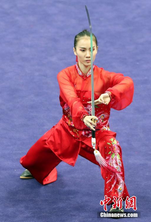 8月28日,天津全运会武术套路比赛在天津理工大学体育馆举行,图为河北选手巨文馨在女子太极剑比赛中。中新社记者 张宇 摄