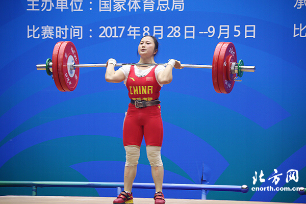 转战挺举比赛后,黎雅君和廖秋云首举120公斤成功,同样来自广东的选手陈艳玲则在第二次挺举时拿下120公斤成绩,但陈艳玲挺举122公斤未成功。当黎雅君挺举122公斤两次未果后,场上出现“惊人”一幕,廖秋云第二举目标由122公斤提高到127公斤,最终,廖秋云不负众望,放弃第三举,以5公斤突增重量赢得金牌。