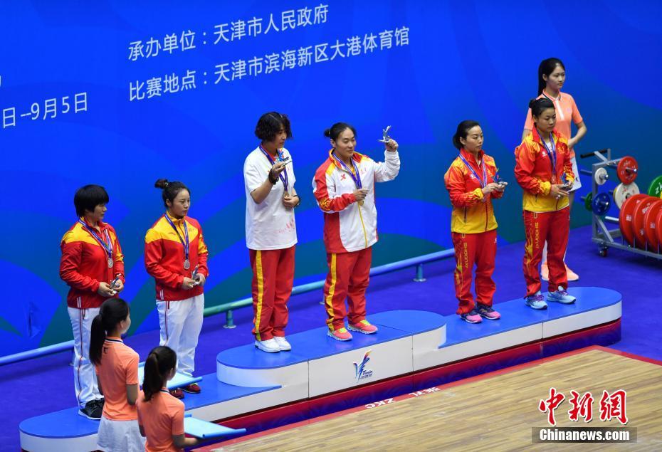 8月29日,天津全运会女子58公斤级举重决赛现场,来自福建的柴丽娜以抓举105公斤、挺举133公斤、总成绩238公斤获得冠军。图为该决赛颁奖仪式。中新社记者 翟羽佳 摄