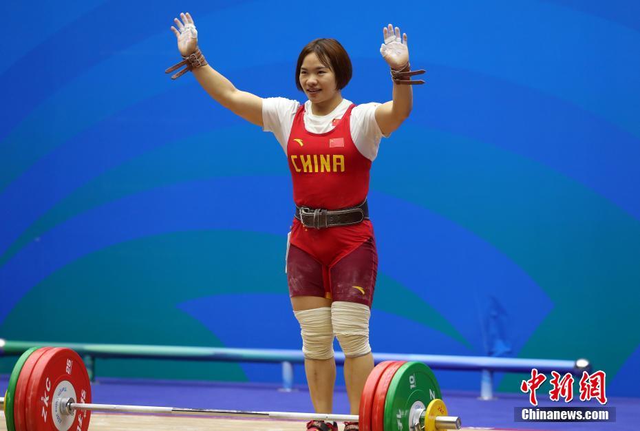8月30日,天津全运会女子举重69公斤级比赛在大港体育馆举行,里约奥运冠军、湖南选手向艳梅夺金。中新社记者 张宇 摄
