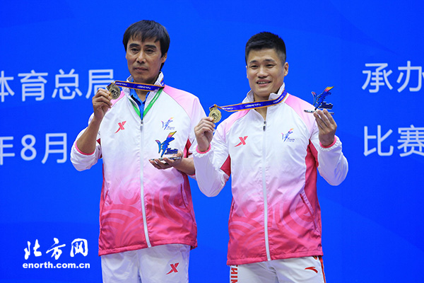 挺举中,吕小军再次出场,开把他便成功举起191公斤,随后的第二次试举中,他又成功举起196公斤,此时他已经将这枚金牌收入囊中。最后一次试举中,吕小军继续挑战突破自己,不过遗憾没有成功,最终他的挺举成绩定格在196公斤,以总成绩366公斤收获金牌。两名重庆选手也在挺举当中发挥出色,最终以354公斤、352公斤的总成绩收获银牌、铜牌。
