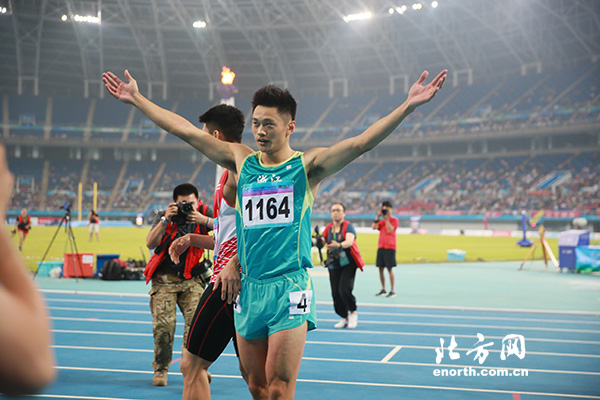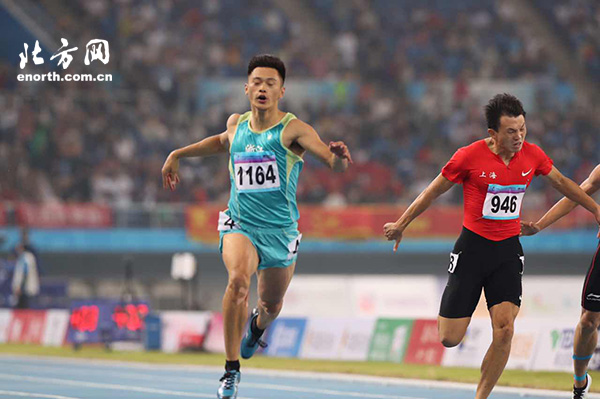 天津北方网讯:第十三届全运会田径项目3日进入第二比赛日的争夺。在汇集了苏炳添、张培萌、谢震业等高手的男子110米决赛中,谢震业凭借10秒04的成绩获得金牌,苏炳添位列第二,新的“中国速度”在天津奥林匹克中心诞生。