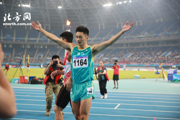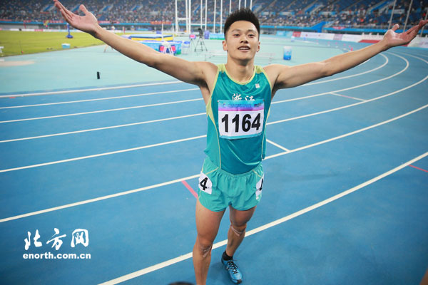 天津北方网讯:9月3日晚,“百米飞人大战”在天津奥林匹克中心如约开战。谢震业、苏炳添、张培萌共同站在决赛赛场上,他们也是如今中国短跑的领军人物。最终,谢震业10秒04战胜夺冠热门苏炳添,获得首枚个人全运会金牌。