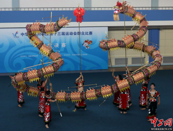 上海三林舞龙队以天龙、地龙、水龙为表演核心,观赏性也更加突出。三林舞龙源起于上海浦东新区三林镇,是当地一项重要的传统民俗体育活动,有着悠久的历史。同时也被国家列入非物质文化遗产名录。“第一次参加全运会,而且我们的这支队伍完全是群众自发组建的。希望舞龙舞狮项目可以借助全运会,得到更好的推广与发展”上海市龙狮协会会长卢月弟说。