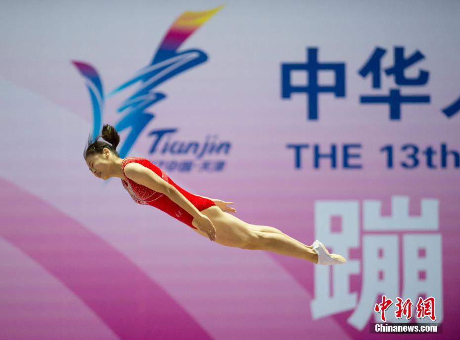 8月29日,天津全运会进行蹦床项目团体决赛。最终广东队摘得女子团体比赛的金牌,上海队夺男子团体赛金牌。图为女子团体赛网上比赛项目,福建队队员陈露在比赛中。中新社记者 李卿 摄