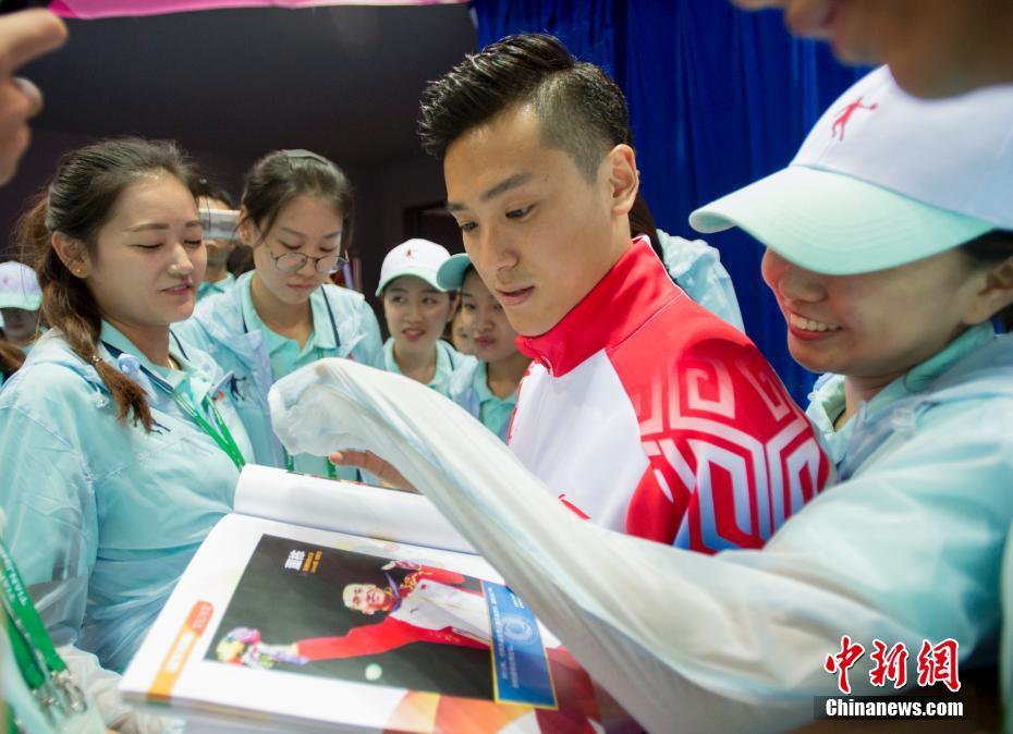 8月29日,天津全运会进行蹦床项目团体决赛。最终广东队摘得女子团体比赛的金牌,上海队夺男子团体赛金牌。图为比赛结束,志愿者们将董栋包围索要签名。中新社记者 李卿 摄