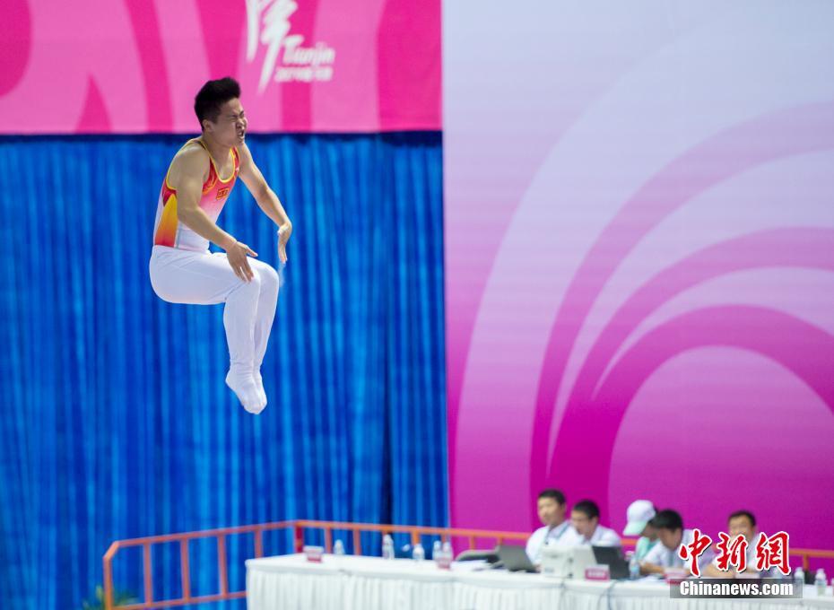 8月29日,天津全运会进行蹦床项目团体决赛。最终广东队摘得女子团体比赛的金牌,上海队夺男子团体赛金牌。图为男子团体赛网上比赛项目,山东队队员黄程程在比赛中。中新社记者 李卿 摄