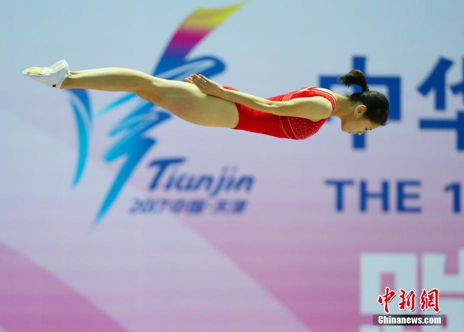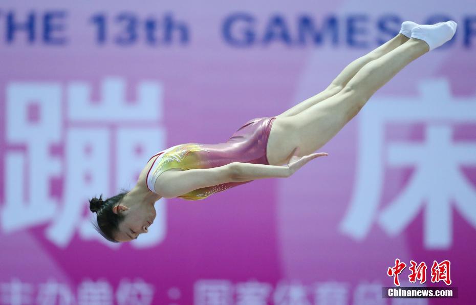 8月29日,第十三届全运会蹦床女子团体决赛在天津举行。图为运动员在比赛中。中新社发 张雷 摄