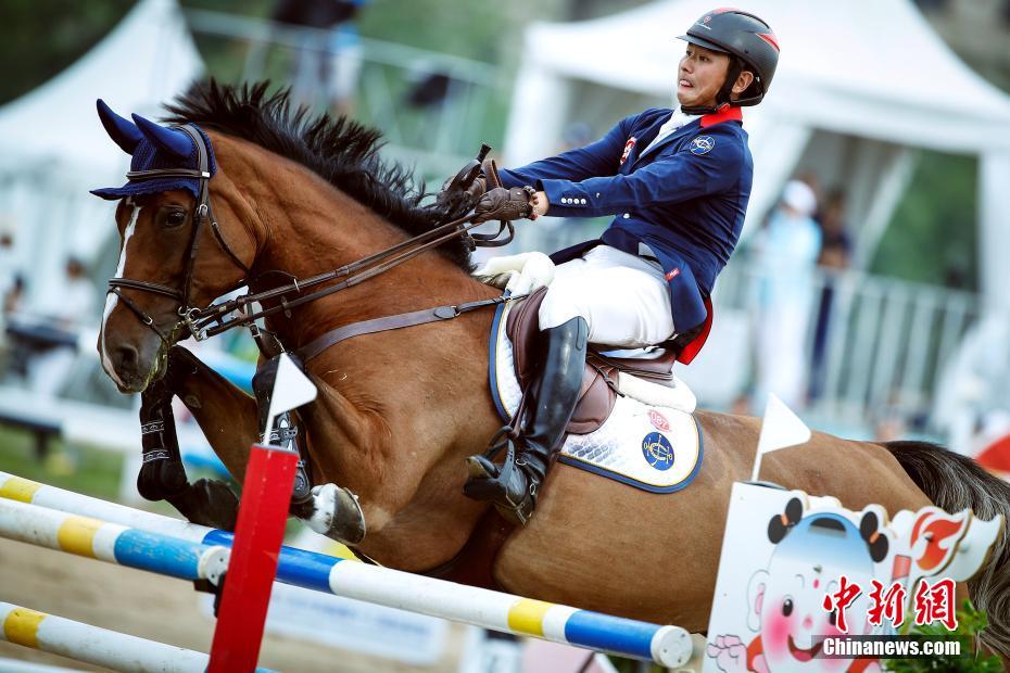 8月29日,香港队骑手郑文杰在比赛中撞落障碍横杆。当天,第十三届全运会马术项目比赛在天津环亚马球公园拉开战幕。中新社记者 佟郁 摄