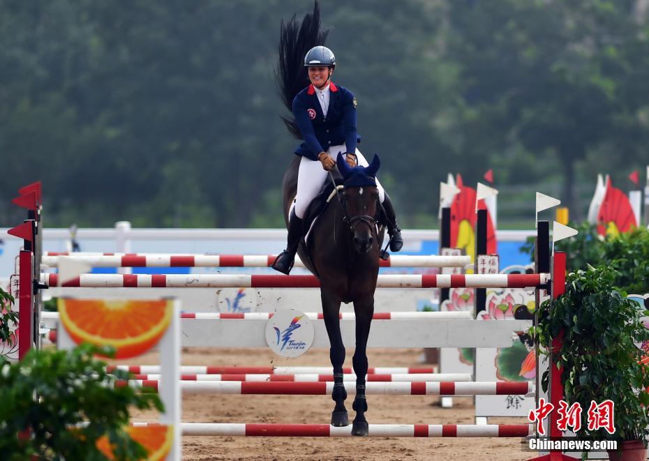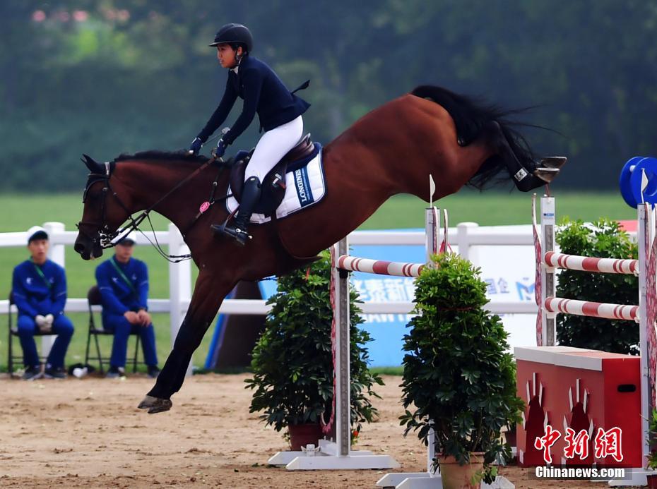 8月31日下午,全运会马术场地障碍个人赛决赛在天津环亚马球会举行,来自香港的黎嘉怡与华人华侨朱美美同时夺得该项目第三名。图为香港黎嘉怡。中新社记者 翟羽佳 摄