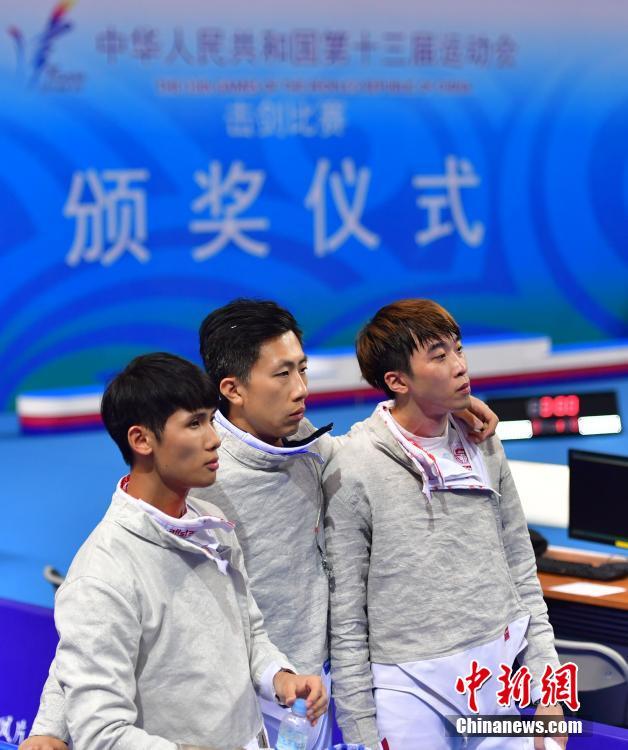 9月1日,天津全运会男子佩剑团体赛,香港队(上)夺得该项目第七名。 中新社记者 翟羽佳 摄
