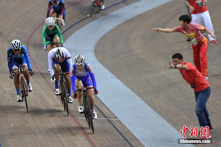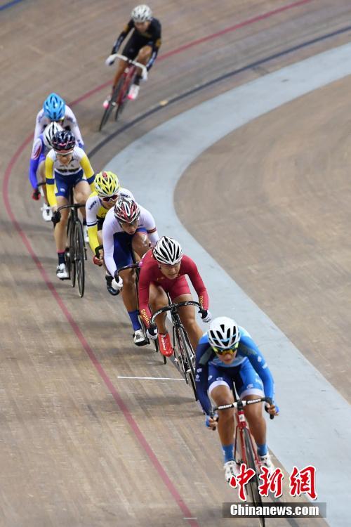 9月1日,天津团泊体育中心自行车馆,场地自行车女子麦迪逊赛进行激烈角逐。最终,香港自行车队获得冠军收获本届全运会首金。 中新社记者 武俊杰 摄