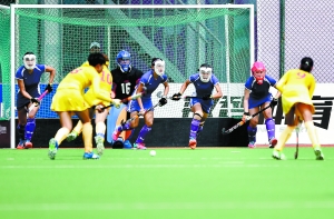 8月21日,全运会女子曲棍球项目开赛。在女子曲棍球A组的一场比赛中,四川队以10比1战胜天津队。图为比赛中。 新华社记者 岳月伟摄