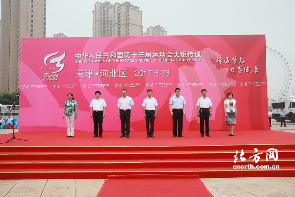 天津北方网讯:8月23日上午9:00,中华人民共和国第十三届运动会火炬传递仪式第十四站在天津市河北区进行。随着河北站第一棒火炬手徐文华从天石舫码头出发,第十三届全运会火炬传递仪式河北站正式开始。