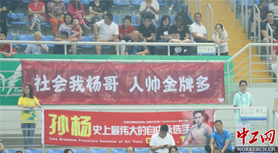 中工网天津8月31讯(记者 谷永光)“社会我杨哥,人帅金牌多!孙杨,你是中国航母!杨哥,稳!”。在第十三届全运会游泳比赛现场观众席上,孙杨的“迷妹”“粉丝”们拉出横幅打出标语,用当下最流行、最热血的文字表达自己对偶像的支持。全运会游泳比赛现场观众席,粉丝们为孙杨拉出横幅打出标语。中工网记者 谷永光摄