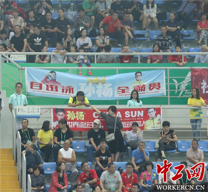 “社会我杨哥,人帅金牌多!孙杨,你是中国航母!杨哥,稳!”。在第十三届全运会游泳比赛现场观众席上,孙杨的“迷妹”“粉丝”们拉出横幅打出标语,用当下最流行、最热血的文字表达自己对偶像的支持。全运会游泳比赛现场观众席,粉丝们为孙杨拉出横幅打出标语。中工网记者 谷永光摄