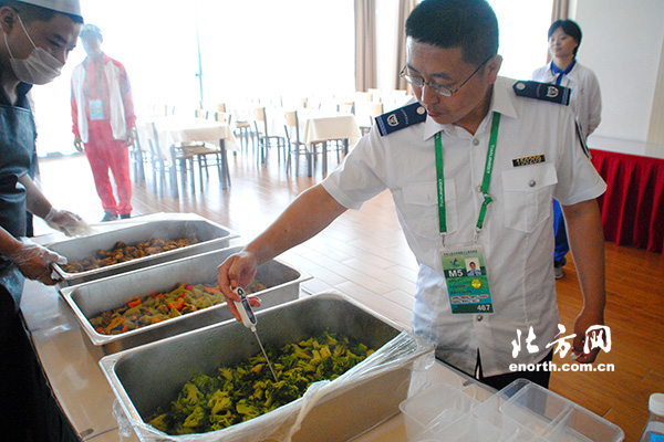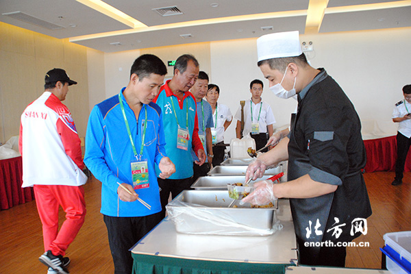 全运射箭项目比赛地点在在天津团泊体育中心射箭场,距离运动员休息就餐的全运村有20多公里的路程。经过上午的淘汰赛,下午选手们将继续进行金牌的角逐。为了保证决赛运动员的休息,不用往返于全运村和团泊赛场,全运村餐饮服务中心特别将准备好的饭菜,送到团泊运动员食堂,让运动员能够在赛场就能吃到可口的饭菜。