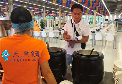 5点的全运村四下寂静,天刚刚蒙蒙亮,房鹏已经离开了全运村宿舍,赶往全运村的三个食堂。检查食材供货情况,保障供应量足质好,这是把好用餐安全的重要一环,也是他每天工作的开始。来自河西区市场监管局的他,被指定为此次全运村餐饮中心的联络员,被村里人亲切地称为“全运村饮食保姆”。