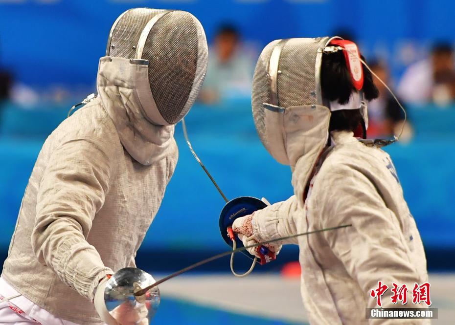 9月1日,天津全运会男子佩剑团体赛半决赛,江苏对阵上海。图为孙伟(左)与何伟对抗。 中新社记者 翟羽佳 摄