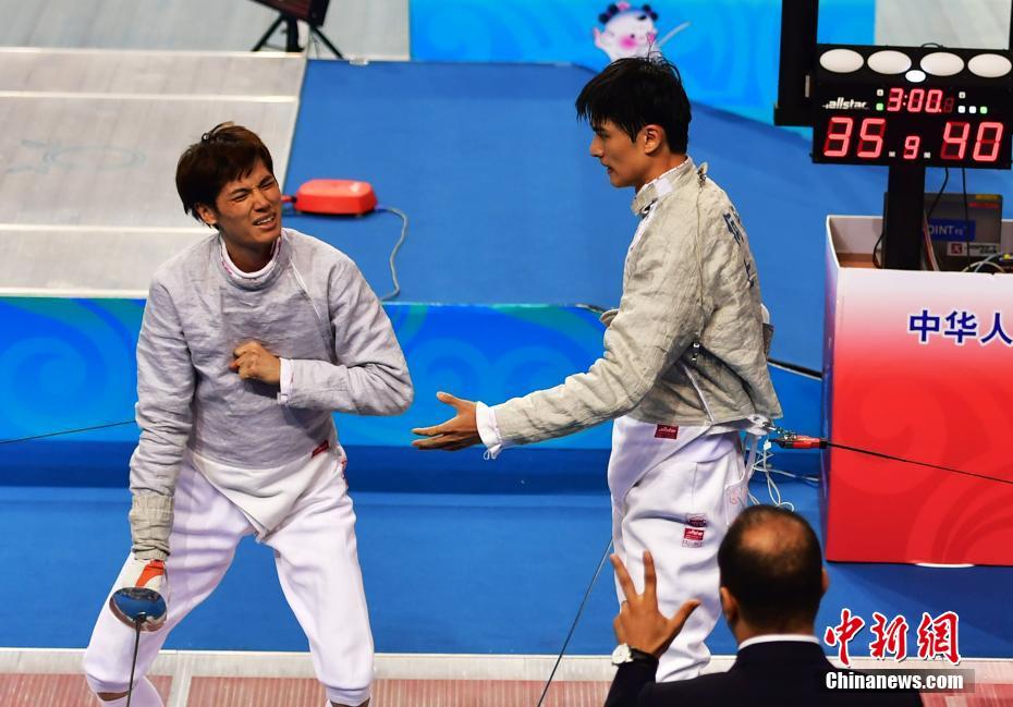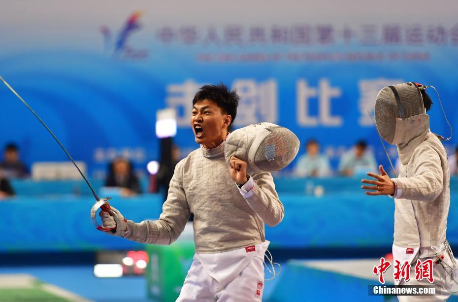 9月1日,天津全运会男子佩剑团体赛,由北京奥运会冠军仲满(左)领衔的江苏队在半决赛对阵上海队。此前,仲满曾带领江苏队两获全运会团体冠军。 中新社记者 翟羽佳 摄