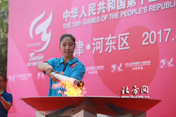 上午9:26,最后一名火炬手殷娜手持火炬来到火炬传递河东站的终点——天津音乐学院并点燃圣火盆,全运会火种随后封存并被送往下一站。第十三届全运会火炬传递仪式河东站圆满结束。火炬手殷娜是现天津女子排球队队员,9岁从河东业余体校开始接触排球,2000年进入天津市体校,15岁进入天津女排,至今为天津女排效力已有14年,多次入选过国少、国青、国家队,也跟随天津女排共同获得了8次全国女排联赛冠军,并蝉联三届全运会冠军,创造并见证了天津女排的辉煌。