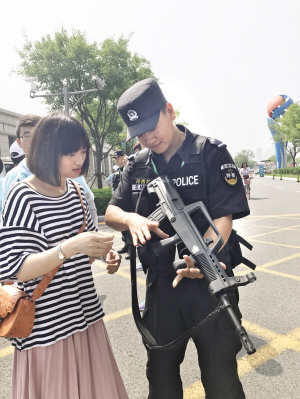 露天展台的一件件物品,都是平时在警匪大片儿里才能见到的奇怪装备。排爆装备大到防爆罐,小到防割手套,都让参观者觉得新鲜又刺激。记者发现,现场对枪支感兴趣的志愿者并非只有男孩子,很多女生都对突击步枪跃跃欲试。一名学生记者接过特警队员手里的95式突击步枪,在特警队员的指导下,学习正确握枪的姿势。还有一些学生在一边试穿特种排爆服装、头盔,在武警官兵的协助下,一名志愿者试着戴了一下头盔,刚一戴好就忍不住大喊:“好沉啊!”