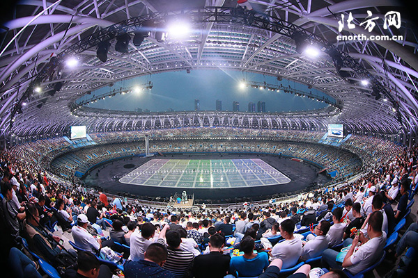 《歌唱祖国》《在希望的田野上》两首与天津渊源很深的歌曲回荡在开幕式上,熟悉的旋律令不少观众热泪盈眶。而当天津地标建筑──“天津之眼”出现在场上时,全场欢声雷动。“天津之眼”随后一分为五,象征着奥运五环。