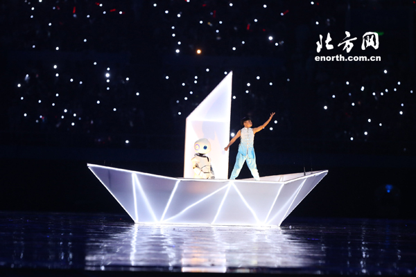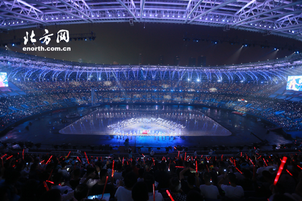 在开幕式文体展演中,整个“水滴”体育场的地面就是一个屏幕,通过3D效果配合演员表演,呈现立体效果,精彩纷呈。