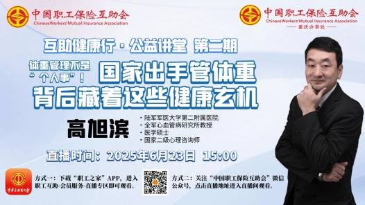 6月23日(周一)下午15:00至16:30,由中国职工保险互助会主办、中互会重庆办事处承办的2025年第二期“互助健康行•公益讲堂”——《体重管理不是“个人事”!国家出手管体重,背后藏着健康玄机》,开启线上直播。本期“互助健康行·公益讲堂”线上直播活动邀请陆军军医大学第二附属医院(新桥医院)全军心血管病研究所教授、医学硕士、执业医师、国家二级心理咨询师、重庆医学会医师学会神经内科专委会睡眠学组委员、重庆市心理健康学会理事、重庆市心理健康学会综合医院会诊专委会副主委、重庆医师协会基层医务工作者分会副会长兼心理健康学组组长、身心健康管理专家高旭滨教授,和职工会员们聊一聊体重管理对家庭、社会的重要影响,以及肥胖者的心理状态和体重超重的重要原因。