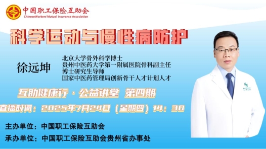 2025年7月24日(周四)下午14:30至16:00,由中国职工保险互助会主办、中互会贵州省办事处承办的2025年第四期“互助健康行•公益讲堂”——《科学运动与慢性病防护》,开启线上直播。本期“互助健康行·公益讲堂”线上直播活动邀请贵州中医药大学第一附属医院骨科副主任,教授 、博士研究生导师,国家中医药管理局创新骨干人才计划人才,贵州中医药大学第一附属医院中医骨伤科后备学科带头人,世界中医药联合会骨伤分会常委,贵州省医学会骨科学第十三届委员会委员,世界数字骨科学会中华数字骨科学会贵州分会第一届委员徐远坤教授,和职工会员们聊一聊科学运动和慢性病防护之间的关系,如何通过科学运动有效降低慢性病发病风险,显著提高生活质量。中工网首页、微博、抖音号同步播出。