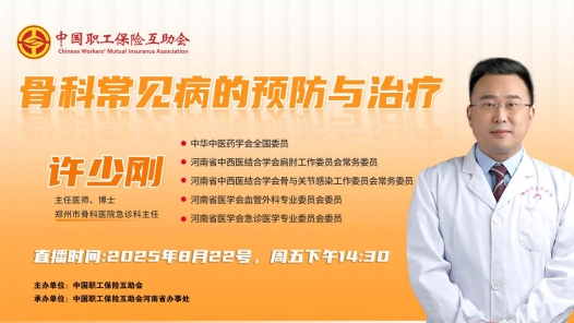 8月22日(周五)14:30至16:00,由中国职工保险互助会主办、中互会河南省办事处承办的2025年第五期“互助健康行•公益讲堂”——《骨科常见病的预防与治疗》,开启线上直播。本期“互助健康行•公益讲堂”线上直播活动邀请郑州市骨科医院急诊科主任、中华中医药学会全国委员、河南省中西医结合学会肩肘工作委员会常务委员、河南省中西医结合学会骨与关节感染工作委员会常务委员、河南省医学会血管外科专业委员会委员、河南省医学会急诊医学专业委员会委员专家许少刚博士,和职工会员们聊一聊骨科常见病的预防与治疗。中工网首页、微博、视频号同步播出,欢迎广大职工网友在线收看直播!
