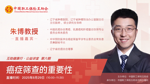 8月29日(周五)上午10:00至11:30,由中国职工保险互助会主办、中国职工保险互助会沈阳办事处承办的2025年第六期“互助健康行•公益讲堂”——《癌症筛查的重要性》,开启线上直播。本期“互助健康行•公益讲堂”线上直播活动邀请辽宁省肿瘤医院暨大连理工大学附属肿瘤医院、辽宁省肿瘤防治办公室副主任,主任医师、硕士研究生导师,中华预防医学会癌症筛查早诊专业委员会常务委员兼副秘书长,中国抗癌协会胃癌、乳腺癌和肝癌整合防筛专业委员会常务委员,辽宁省抗癌协会理事朱博教授,和职工会员们聊一聊什么是癌症筛查,筛查在癌症三早预防中的重要作用。