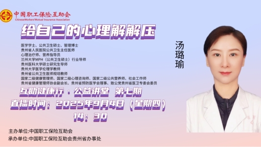 亲爱的职工朋友们,是否有时候被工作压得喘不过气?有没有被焦虑缠得夜不能寐?别让压力成为生活的“隐形负担”!这场“给自己的心理解解压”科普讲座,带您拆解压力密码,学会给情绪松绑,用科学方法帮您读懂压力、对抗压力,解锁更从容的生活方式!2025年9月4日(周四)下午14:30至16:00,由中国职工保险互助会主办、中互会贵州省办事处承办的2025年第七期“互助健康行·公益讲堂”——《给自己的心理解解压》,开启线上直播。本期“互助健康行·公益讲堂”线上直播活动邀请了医学学士、公共卫生硕士、管理博士,贵州省人民医院公共卫生主任医师、心理治疗师、营养指导员,兰州大学MPH(公共卫生硕士)行业导师,贵州医科大学硕士研究生导师,贵州大学医学伦理学教师,贵州省公共卫生医师规培教师,国家二级健康管理师、国家二级心理咨询师、国家二级公共营养师、社会工作师,贵州省健康管理师协会副会长,贵州省预防医学会理事、致公党贵州省医卫专委会委员汤璐瑜老师,和职工会员们聊一聊如何多途径通过科学有效的方式降低心理压力,学习实用心理调节技巧,让心理能量做到“待机一整天”。中工网首页、微博、视频号同步播出,欢迎广大职工网友在线收看直播!
