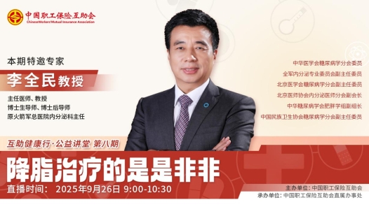 亲爱的职工朋友们,您是否关注过自己的血脂报告?面对“高脂血症”的诊断,您是否有所困惑? 血脂与内分泌系统息息相关,科学管理血脂是维护全身健康的重要一环。为帮助大家科学认识血脂异常、厘清降脂治疗的常见误区、掌握血脂管理策略,中国职工保险互助会特主办2025年第八期“互助健康行·公益讲堂——《降脂治疗的是是非非》”,开启线上直播。本期活动由中国职工保险互助会直属办事处承办,特别邀请内分泌代谢领域权威专家,带您深入探讨“降脂治疗的是是非非”,从专业角度解读指南、分析利弊,为您提供基于内分泌代谢特点的个体化血脂管理建议,助您做出明智的健康选择!