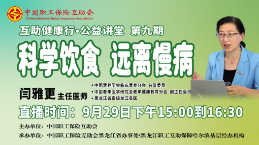 9月29日(周一)下午15:00到16:30,由中国职工保险互助会主办、中互会黑龙江省办事处和黑龙江职工互助保障哈尔滨基层经办机构承办的2025年第九期“互助健康行•公益讲堂”——《科学饮食 远离慢病》,开启线上直播。 本期“互助健康行•公益讲堂”线上直播活动邀请哈尔滨医科大学附属第一医院临床营养科主任、中国营养学会临床营养分会名誉委员、中国老年医学研究会老年健康教育分会副主任委员、黑龙江省省级龙江名医、中国医师协会营养医师专业委员会委员、黑龙江省医学会肿瘤营养代谢与治疗专业委员会副主任委员、黑龙江省糖尿病教育学会副会长闫雅更,和职工会员们聊一聊科学饮食肯远离慢病。中工网首页、微博、视频号同步播出。