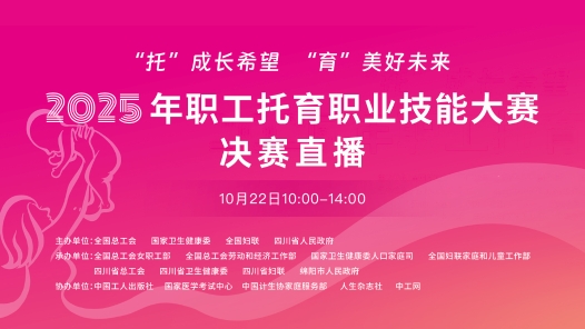 2025年职工托育职业技能大赛决赛于10月21日至24日在四川省绵阳市中国科技城会议展览中心举行。本次大赛由全国总工会、国家卫生健康委、全国妇联、四川省人民政府共同主办,旨在加强托育服务人才队伍建设,推动普惠托育服务体系发展。大赛以“‘托’成长希望‘育’美好未来”为主题,设置“婴幼儿发展引导员”与“保育师”两个工种。全国各省(区、市)及新疆生产建设兵团32支代表队参赛。10月22日10:00,中工网首页、微博、视频号同步播出。