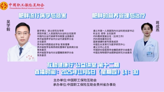 2025年11月6日(周四)下午14:30至16:00,由中国职工保险互助会主办、中互会贵州省办事处承办的2025年第十二期“互助健康行·公益讲堂”开讲啦!这场肥胖专题公益讲堂,专门邀请了遵义市第一人民医院内分泌科党支部书记、科主任、硕导、主任医师蒋成燕主任以及贵阳市第二人民医院内分泌科主任医师、医学博士 、硕士研究生导师吴学毅主任为我们分别讲解《肥胖的营养管理与治疗》、《肥胖流行病学与危害》两个课题。为积极响应国家“健康中国2030”战略,落实“体重管理年”三年行动,让职工朋友们搞懂 “为什么会胖”“胖了到底有多伤身体”“怎么才能健康瘦不反弹”,本期公益讲堂将带您彻底跳出减肥误区,掌握科学管理体重的核心逻辑,从餐桌到生活,从身体到心灵,开启健康生活新篇章!中工网首页、微博、视频号同步播出。