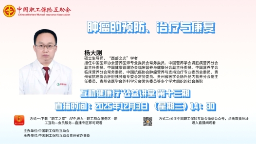 2025年12月3日(周三)下午14:30至16:00,由中国职工保险互助会主办、中互会贵州省办事处承办的2025年第十三期“互助健康行·公益讲堂”——《肿瘤的预防、治疗与康复》开讲啦!为积极响应国家肿瘤防治战略,让职工朋友们真正搞懂“肿瘤怎么防”“查出肿瘤怎么办”“术后如何科学康复”,本期公益讲堂邀请贵州医科大学附属医院杨大刚主任为广大职工朋友们讲解《肿瘤的预防、治疗与康复》这一课题。带您跳出肿瘤防治的认知陷阱,掌握从预防筛查到治疗康复的全流程科学方法,为自己和家人筑牢健康防线!中工网首页、微博、视频号同步播出。